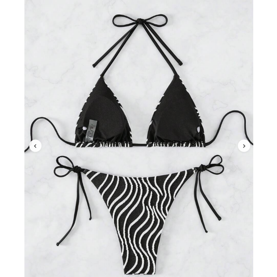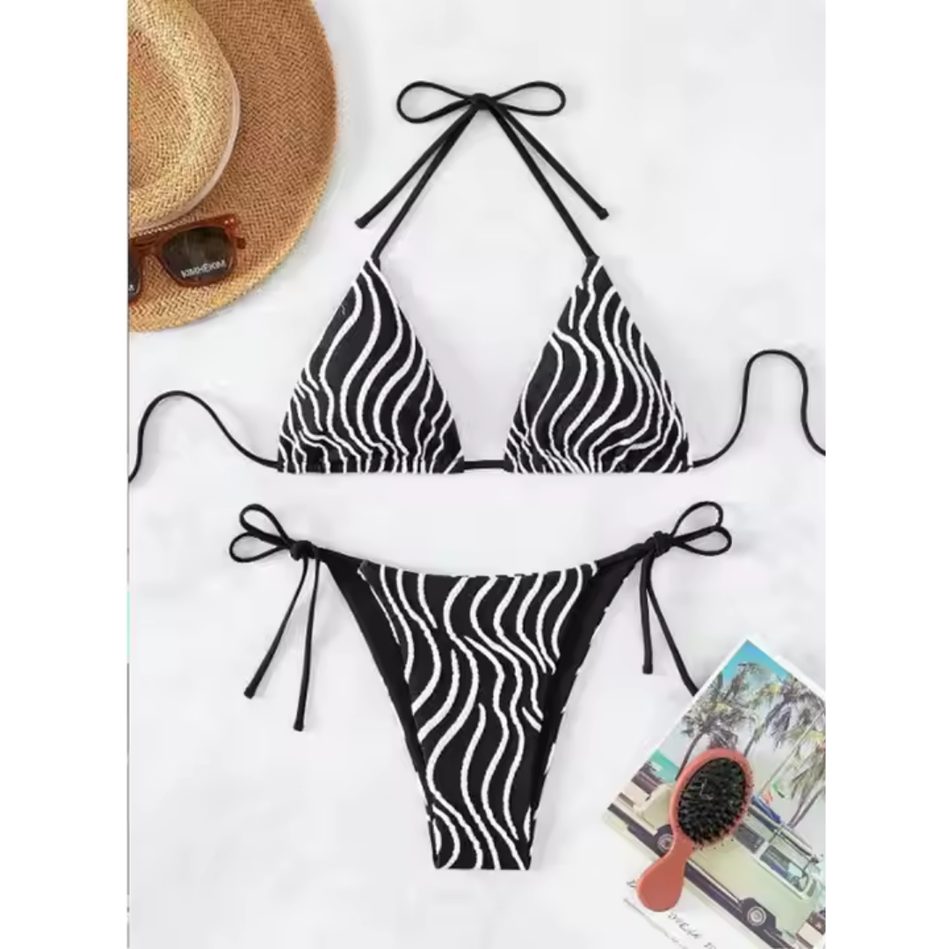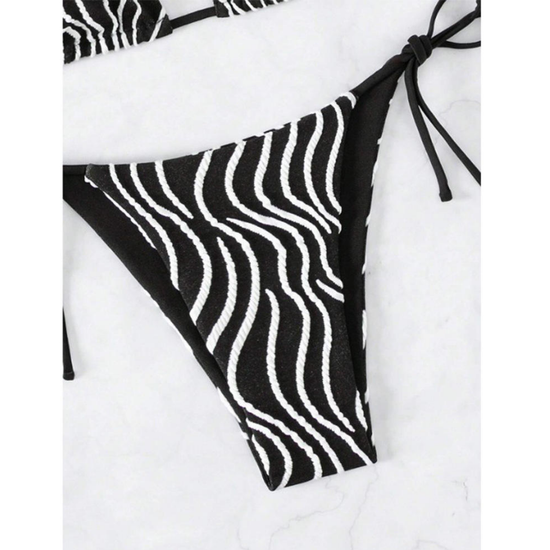 BIKINI SET: The Women 2pc Zebra Striped Halter Triangle Side Tie Bikini Swimsuit is a trendy and stylish swimsuit designed for women who want to make a statement at the beach or pool.