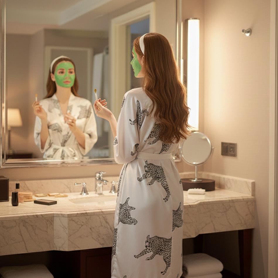ABOUT: FABRIC: High-quality silk satin blend that gives the robe a glossy and soft texture, enhancing the overall luxurious feel. DESIGN: A stylish, loose fit with a wrap-around style, usually accompanied by a tie at the waist for a customizable fit. LEOPARD PRINT: The robe...