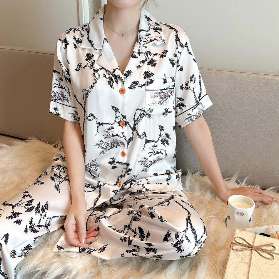 Pleasing Strings Women's 3pcs Silk Satin Branch Print PJ Set