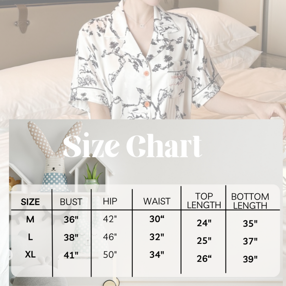 COMPONENTS: Top: The set includes a satin short sleeve shirt, with a button-down design. The top often features a relaxed fit and a Collar Neck, contributing to the overall comfort and elegant look. Long PJ & Shorts: The bottom part of the set typically consists of matching satin shorts & pants, designed to complement the top. The pants have an elastic waistband for added comfort and ease of wear.