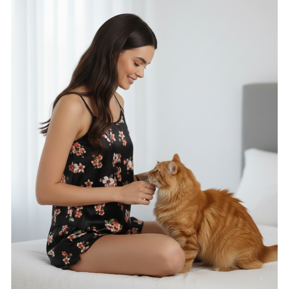 FEATURES: The Women's Floral Print Satin Cami Top with Shorts PJ Set is a stylish and comfortable sleepwear ensemble designed for women. The set typically includes a sleeveless cami top featuring a feminine floral print on satin fabric and matching shorts for bottom wear.
