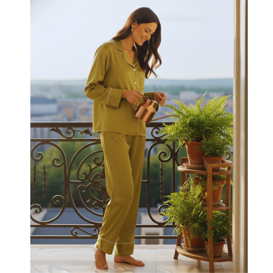 The Women's Premium Silk Luxury Long Sleeves Pyjama Set is a high-quality sleepwear set made from luxurious silk fabric.
