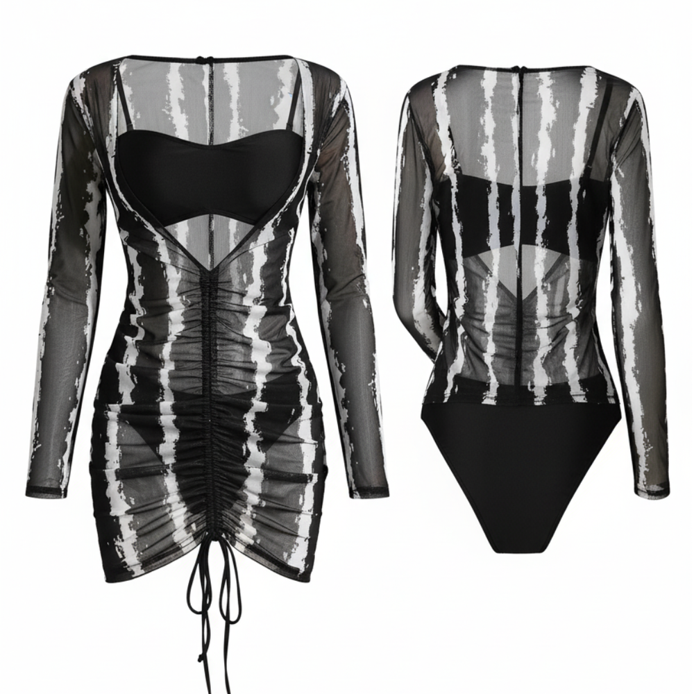 Deep V Beach Coverup Dress, Full sleeves, adjustable drawstring at front, above the knee length, Cover what you want and protect your skin from over sun exposure.