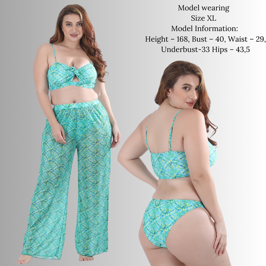 ABOUT: STYLE: Cami Top with Bikini Bottom with Cover Up Pants. A stylish and versatile swimwear set that includes a cami bikini top, bikini bottom, and a matching cover-up pants. The tropical print adds a fun and vibrant touch to the ensemble, perfect for beach...